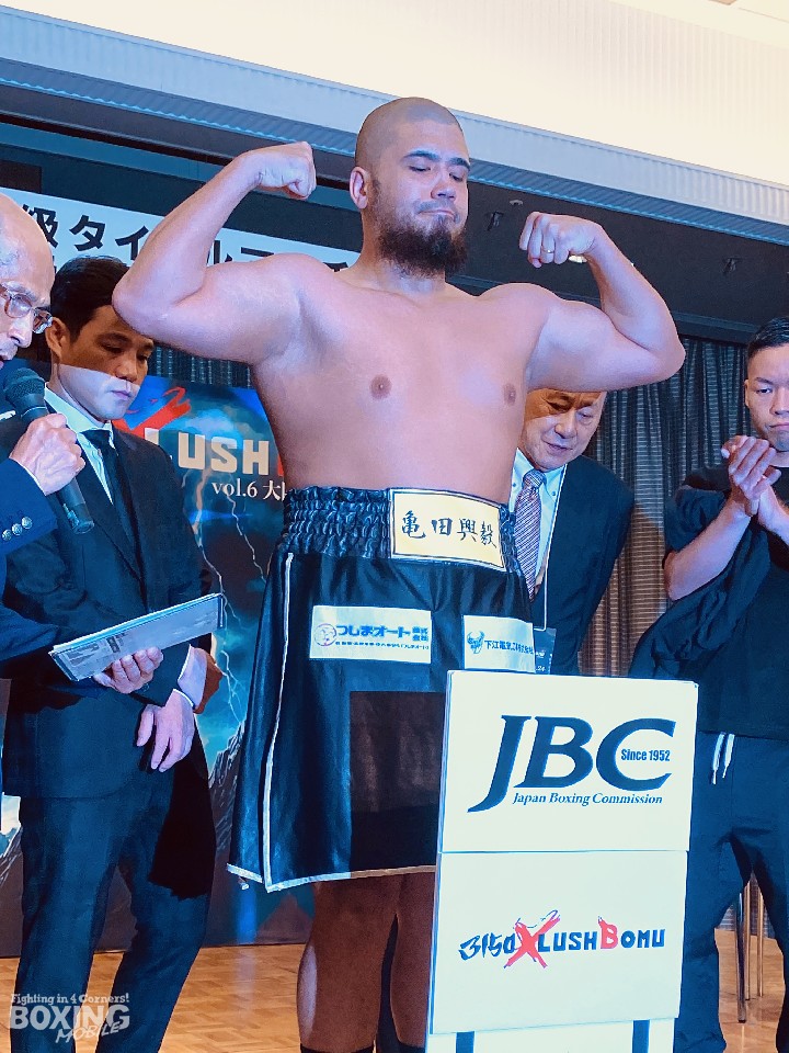 前日本ヘビー級王者の但馬ミツロ(30=亀田)が23日、大阪市内のホテルモントレグラスミアで前日計量と記者会見に臨んだ。