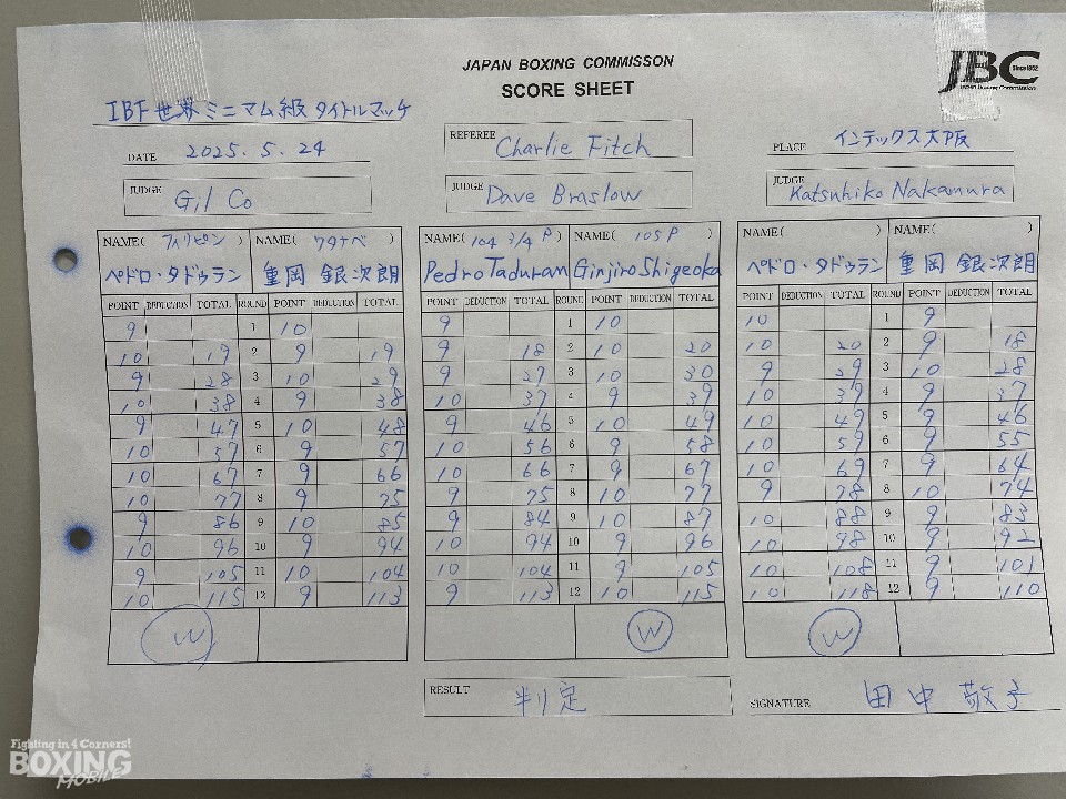 注目のサウスポー対決は、踏み込んで左ストレートを繰り返したタドゥランに対して、左右のボディを叩きながら距離をとってサークリングした銀次朗だが、カウンターを合わせても捉えきれず。最終回の最後まで、淡々と続いたヒットアンドアウェイの我慢比べは、ダウンには繋がらず。ジャッジは2-1でタドゥランが王座防衛に成功した。