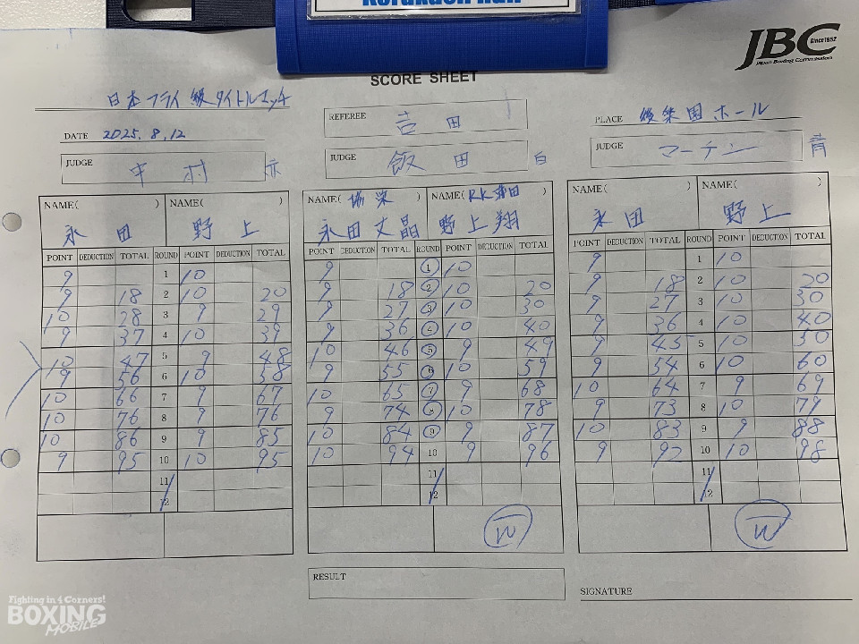 序盤から野上が足を使いながら左オーバーハンド、右ボディを好打し、ペースを掌握。前に出た永田は、ボディを狙うが詰め切れず。その後も野上がリズム感のある攻撃でポイントを加点した。前半終了時時の公開採点をリードした野上は、左ボディを突き刺し攻勢。7回、永田は左ストレートで野上の腰を沈めさせると、ギアを上げて猛追。後半に入りグイグイと攻め立てたが、野上も懸命に打ち返した。前半の貯金を守った野上が、6戦目で新チャンピオンに輝いた。