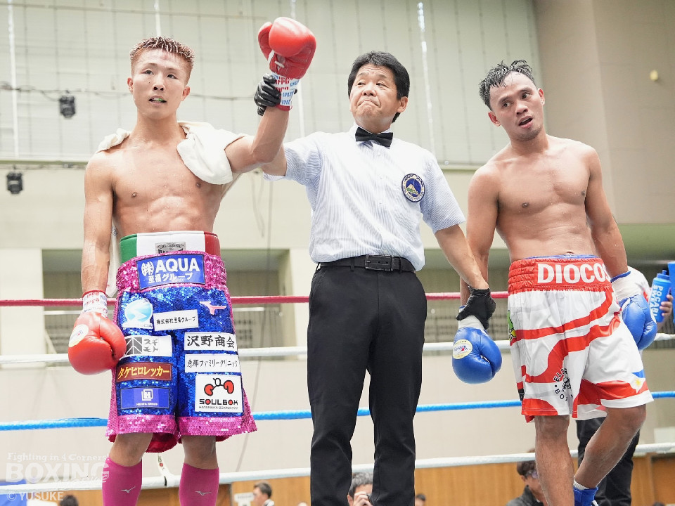 序盤から畑中がジャブを軸にペースを掌握。相手のパンチをブロックすると、右ボディストレートを好打した。中盤から後半に入っても畑中は主導権を渡さず。タフなディオコスを攻め立てて完勝した。