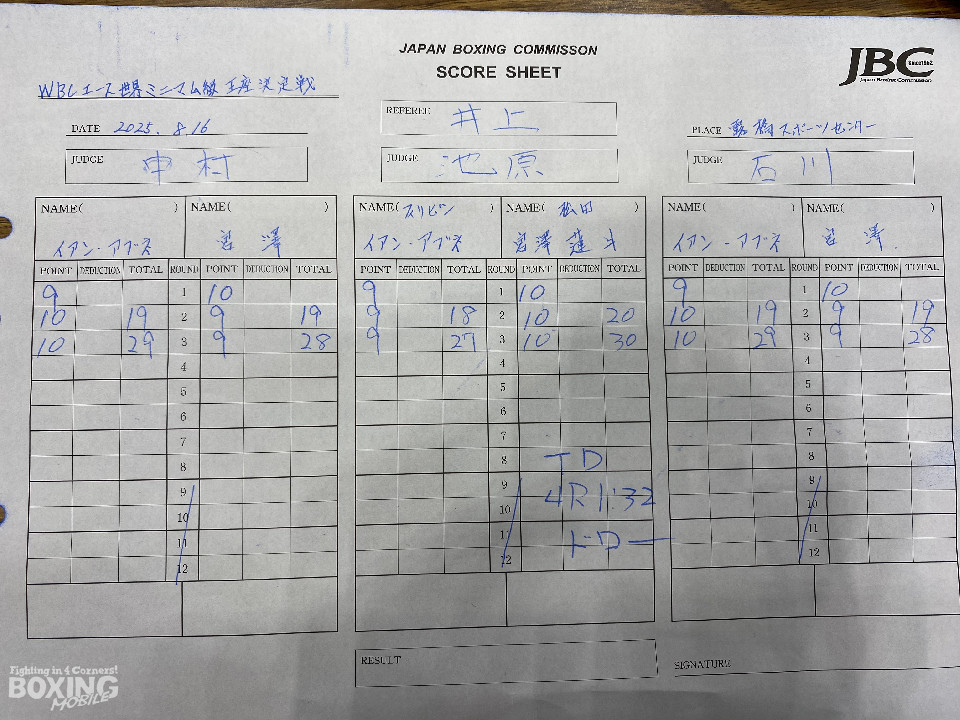 宮澤は、サウスポー・アブネの左ストレートをバックステップで外すと、ジャブから丁寧な組み立て。宮澤は前後の動きを意識しながら戦うのに対し、アブネは圧力を強めながら左を強振した。3回に偶然のバッティングで宮澤は鼻柱、アブネは前頭部をカット。その後も何度も頭がぶつかると、4回に宮澤は右目上をカット。傷が深いためレフェリーは試合続行を許さず。既定のラウンドに達していないため、負傷引き分けでタイトルは空位のままとなった。
