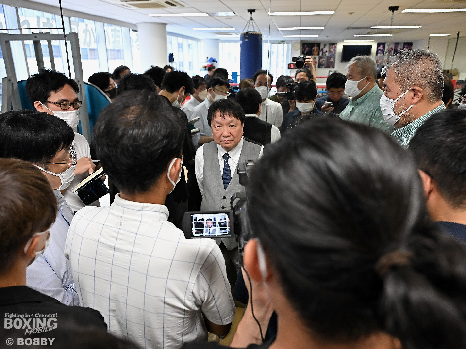 囲み取材で大橋会長は、「エマヌエル・ロドリゲス、ドネア、フルトン、ネリといった強敵と戦ってきたが、それよりも(今回は)はるかに強敵。弱点がないので一段と警戒している」と話すと、「頑丈な選手ほどコロッと倒れる。何となくこうなるという展開は見えている」と冷静に展望を述べた。