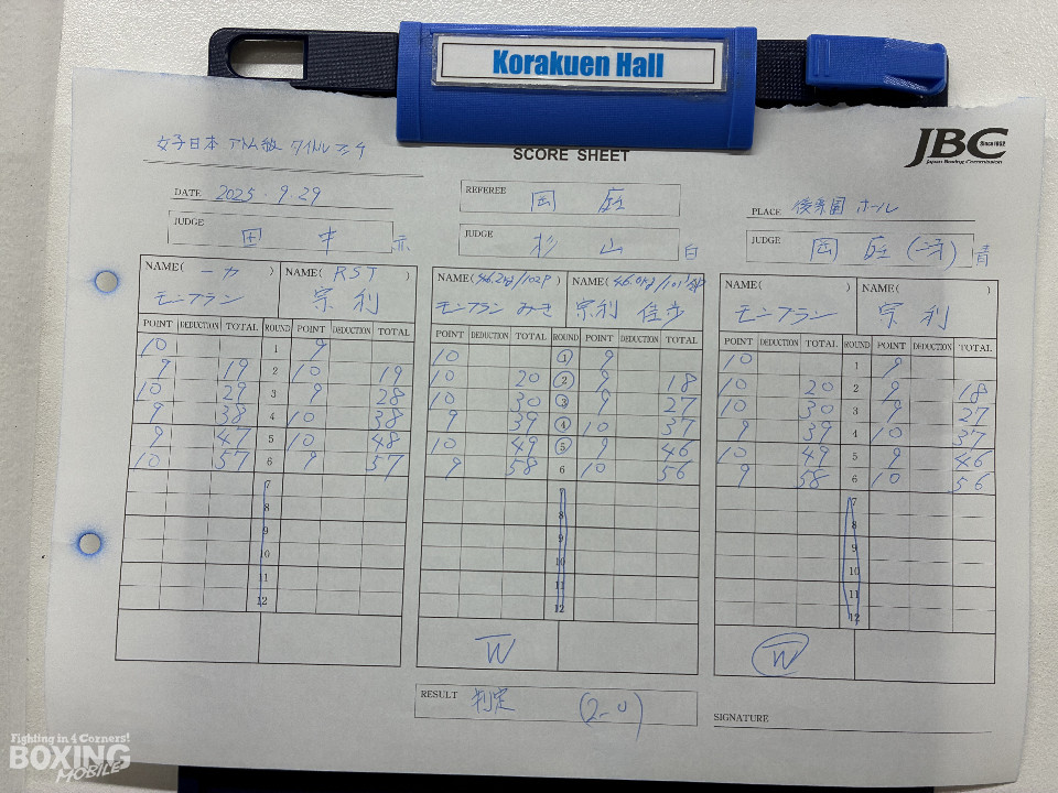 宗利が出入りを活かしながら組み立てるのに対し、モンブランは丁寧にワンツーを返す構図。4回、モンブランはプレスをかけて手数を増やして、ジャッジに攻勢をアピール。宗利も必死に打ち返したが、モンブランの馬力が上回った。