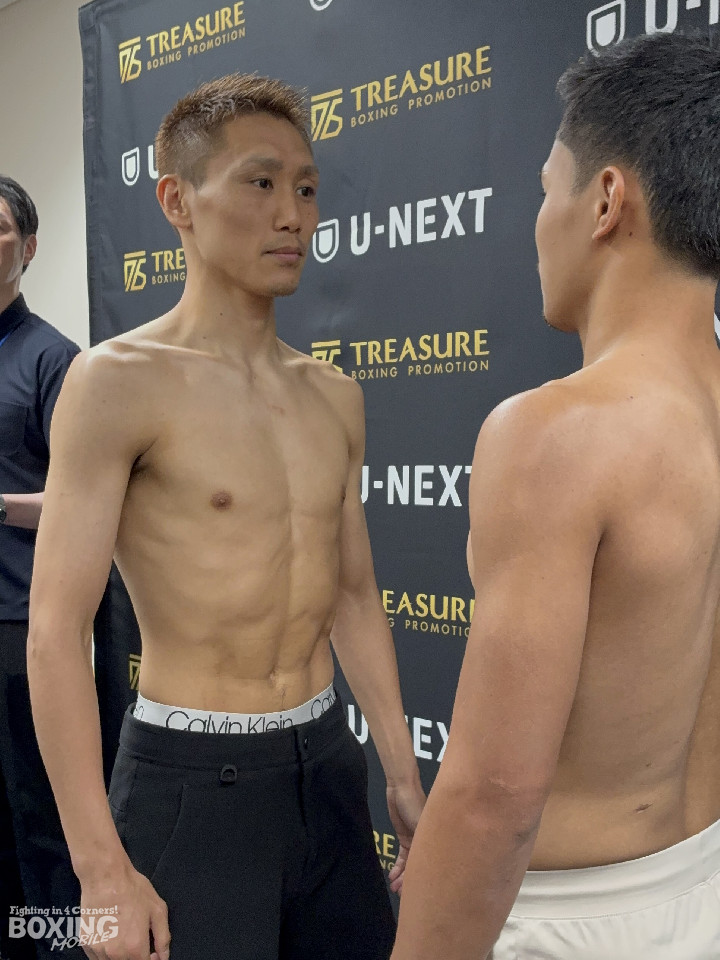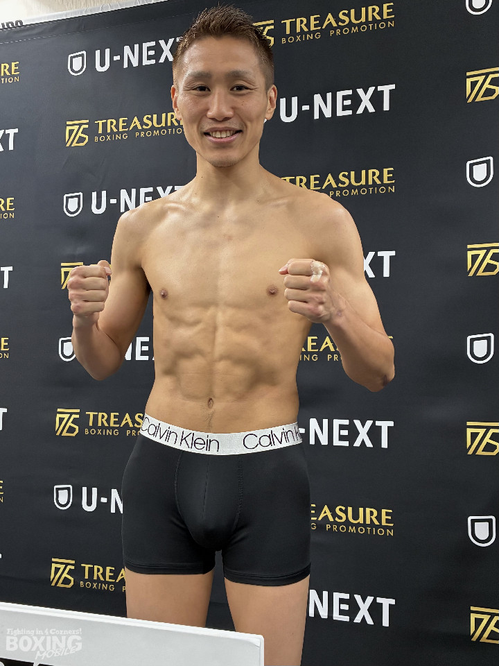 先に秤に乗った小國は、スーパーバンタム級リミットを100g下回る55.2sでクリア。「減量は上手いけど、試合の方がアカン」と冗談を交えつつも、節目の30戦目に向けて表情を引き締めた。