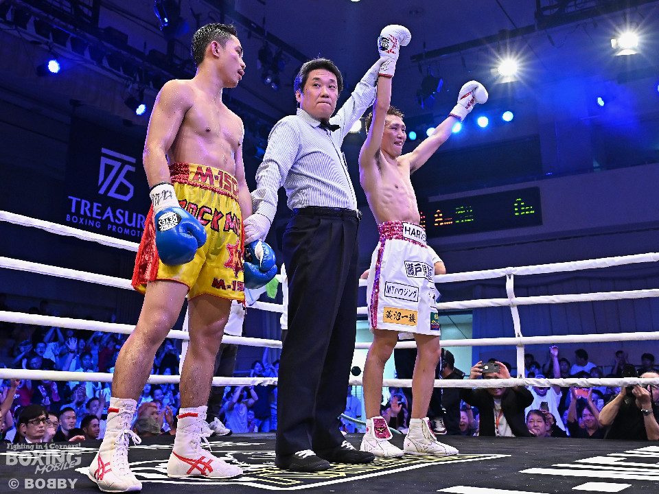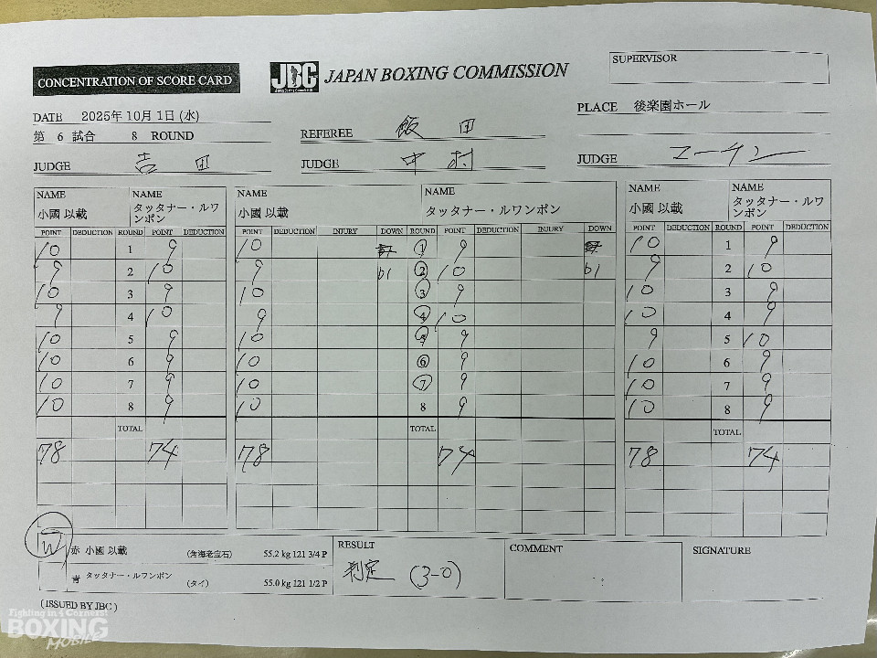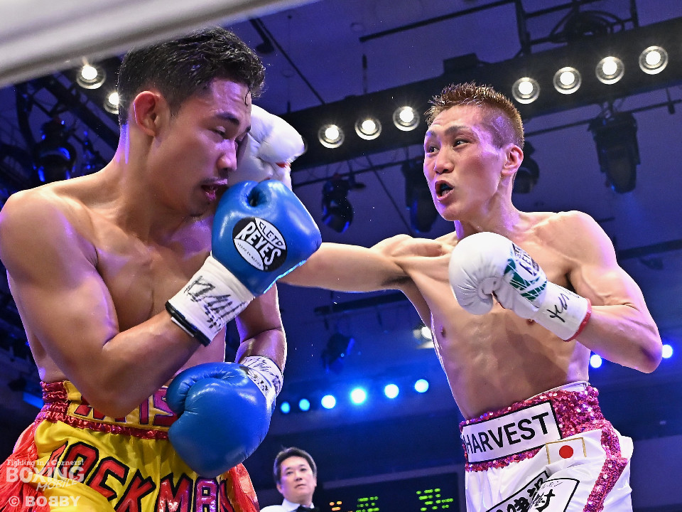 試合が大きく動いたのは2回。左フックが交錯する中、小國が倒れると、タッタナーもキャンバスに手を突き、レフェリーはダブルノックダウンを宣告。再開後、タッタナーは攻勢を強めた。5回以降、小國はワンツー左ボディを軸に積極的な攻撃を展開。前に出るタッタナーに対し、小國は左ボディを突き刺し動きを止めると、右ストレートを好打した。
