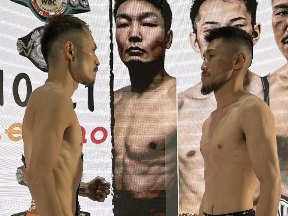 日本フェザー級タイトルマッチで対戦するチャンピオンの阿部麗也(32=KG大和)と、挑戦者で元日本ユース同級王者の殿本恭平(30=勝輝)が20日、東京・水道橋にあるドームシティ内blue-ing! DISCOVERで、前日計量に臨んだ。