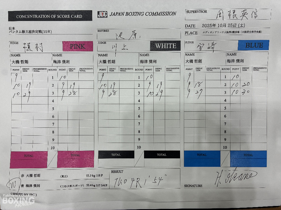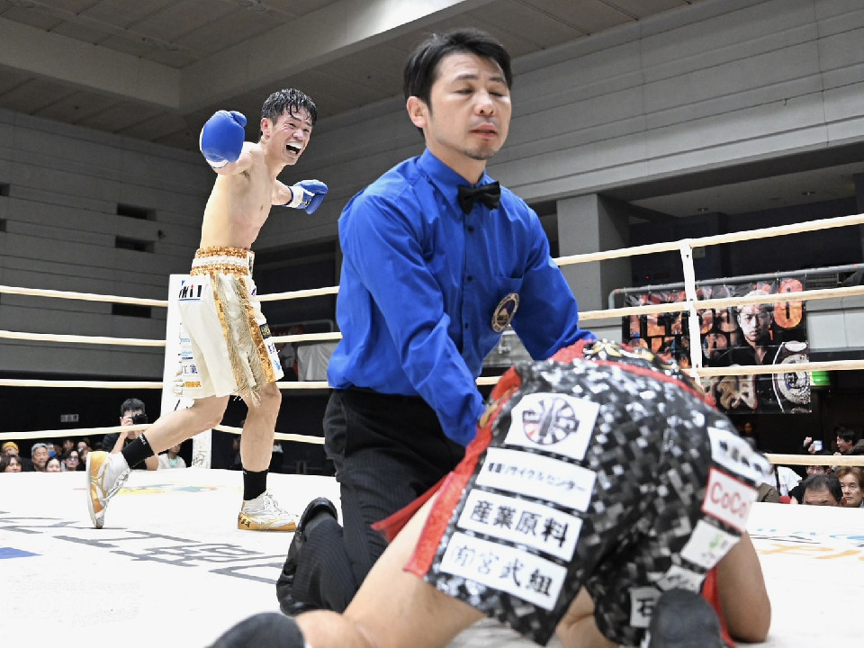 梅津が上下に揺さぶりをかけながら、右フックを叩きつけて先制。2回、サウスポー大橋が左ボディストレートを差し込めば、梅津も右ストレートをコツコツと当てた。4回、梅津は右ボディで効かせると、大橋をロープに詰めて左右フックを強振。痛烈なダウンを奪うと、レフェリーはノーカウントで試合をストップした。
