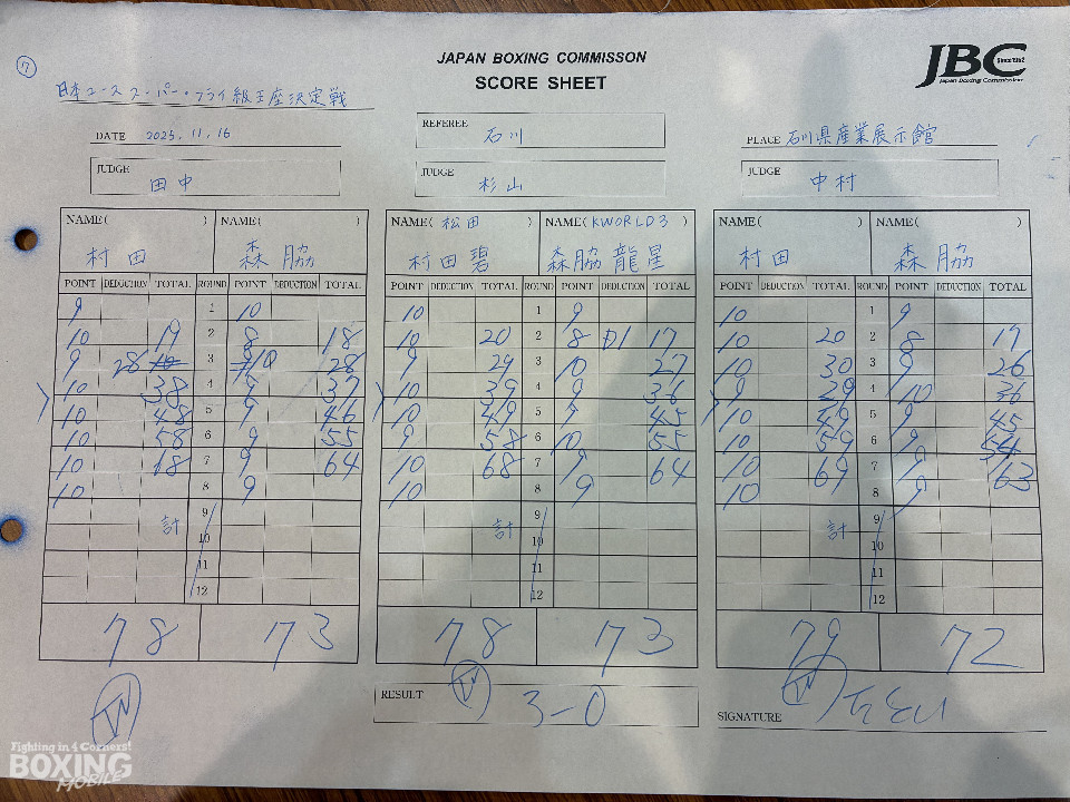 初回は、森脇が前後の動きを意識しながら揺さぶりをかけたが、2回に村田が左フックでダウンを奪取。これでペースを掴んだ村田は、ポジションを意識しながら左ボディを軸にポイントを加点。回転力を活かした連打で、反撃する森脇を振り切った。