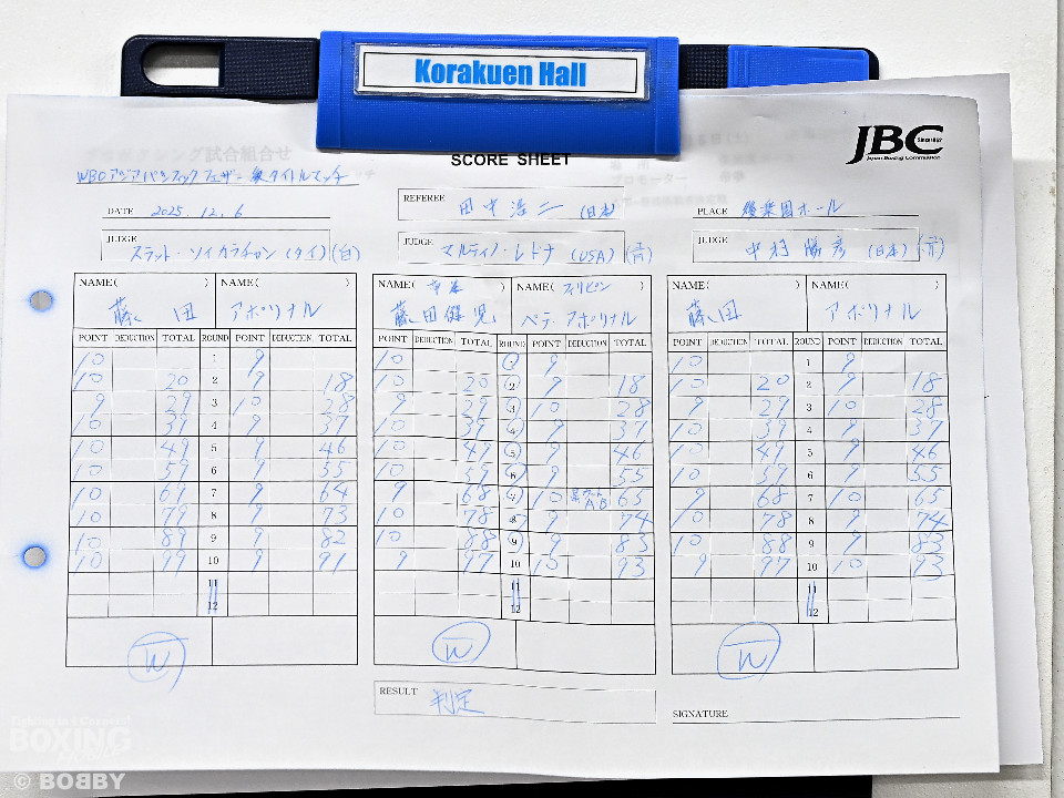 WBOアジアパシフィック(WBO-AP)フェザー級タイトルマッチが6日、後楽園ホールで開催されたDYNAMIC GLOVE on U-NEXT Vol.38のメインイベントで行われ、チャンピオンの藤田健児(31=帝拳)が、同級8位のペテ・アポリナル(30=比)を挑戦者に迎えて、4度目の防衛戦に臨んだ。