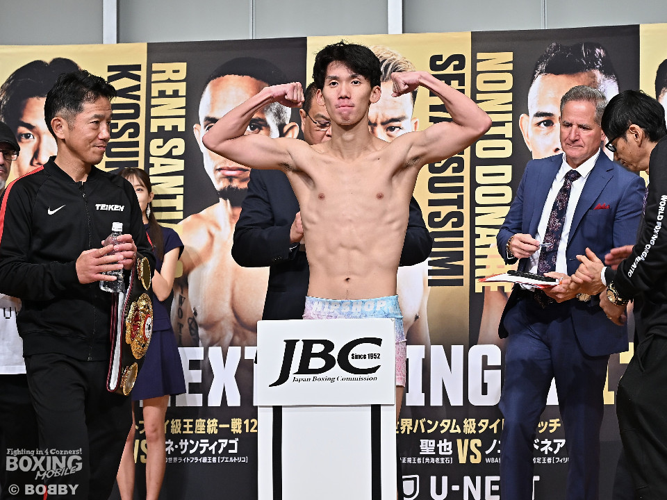 WBA(世界ボクシング協会)王者の高見亨介(23=帝拳)とWBO(世界ボクシング機構)王者のレネ・サンティアゴ(33=プエルトリコ)が16日、ライトフライ級世界2団体王座統一戦の前日計量に臨んだ。両者は、東京・両国国技館で開催される「U-NEXT BOXING 4」のセミファイナルで対戦する。