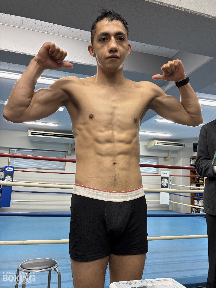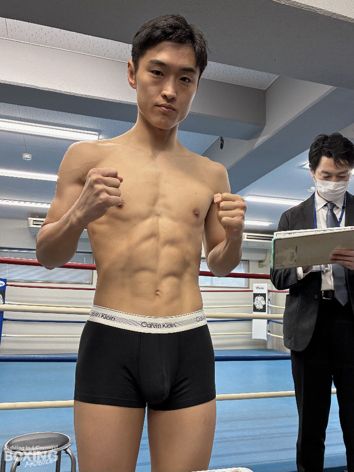 西田はリミットの59.8kgで計量を通過。前日は午後10時に就寝し、当日は午前6時に起床。ウォーキングと軽いシャドーボクシングで体を起こしてからジム入りした。万全のルーティンで迎えた当日計量だった。