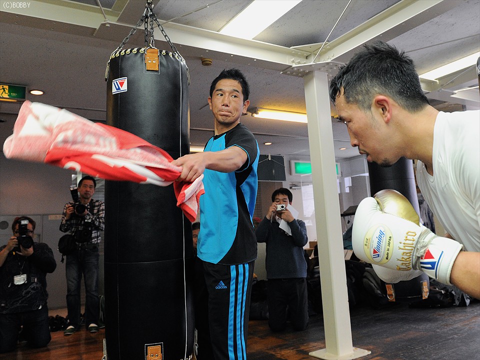 スパー終了後、サンドバックに移った粟生に対し、強打を繰り出す指名挑戦者対策か、田中トレーナーがタオルを振ってディフェンスと重心を意識させバックを打たせていた。
