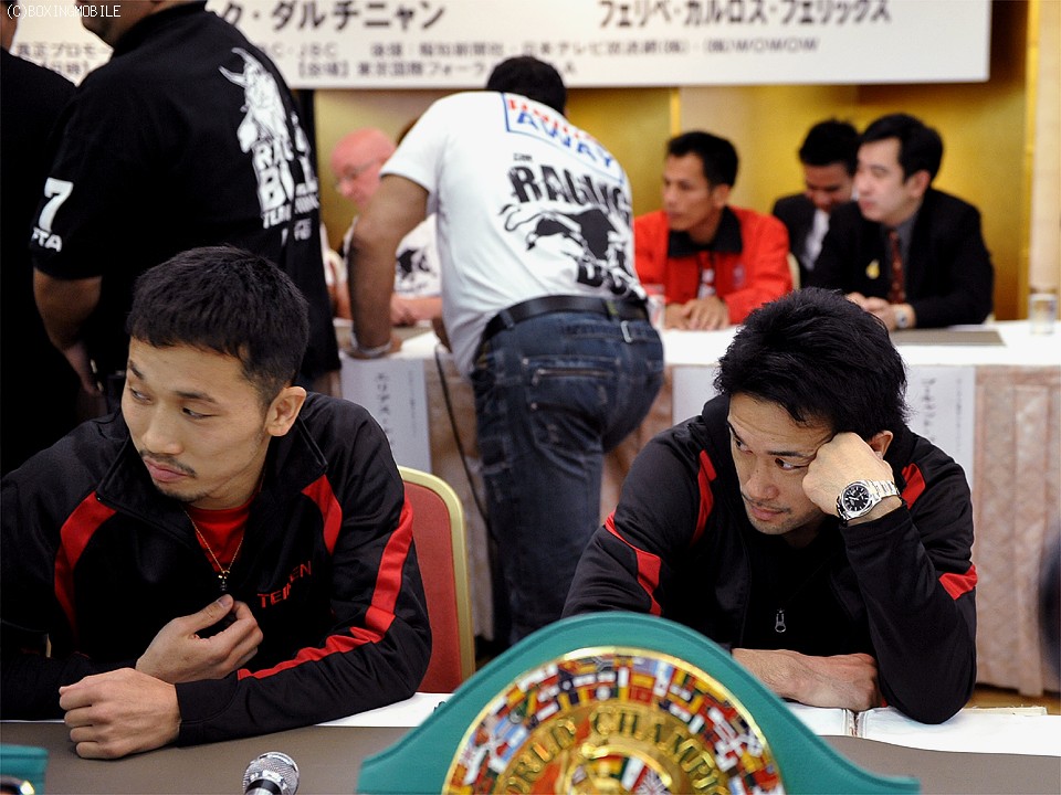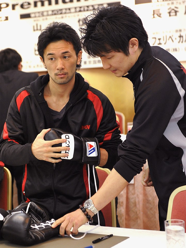 セミとして行われるWBC世界バンタム級タイトルマッチに臨む王者・山中慎介(帝拳)と同級5位の挑戦者ビック・ダルチニャン(豪)は調印式を終え、グローブチェックでは山中のグローブが薄いのではないかとダルチニャン陣営がクレーム。結果的にダルチニャンがつける予定だった青のグローブを山中と同じ黒に変更することで納得した。