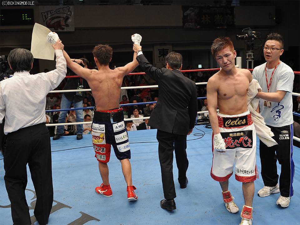 一方、王者・粉川はドクターチェック後、控え室で会見を開いた。「王座決定戦と変わらなかった。強いパンチを入れようと力みすぎ。前半はジャブでリラックスして動けたが、狙いすぎてガードされてしまった。ジャッジに対して見栄えも悪かったと思う」と初防衛も反省しきり。挑戦者・林の印象を求められると「ガードが巧かった。終盤、スタミナが切れたのも分かった。二人とも頭から入り過ぎてしまった」と粉川は苦笑い。