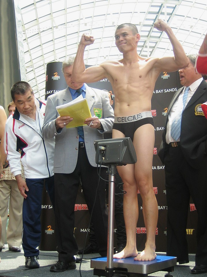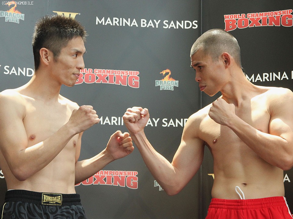 いよいよ明日に迫ったWBA世界フェザー級タイトルマッチ。スーパー王者クリス・ジョン(インドネシア)と挑戦者・木村章司(花形)が4日、決戦の舞台となるシンガポールのマリーナ・ベイ・サンズホテルで公開計量を行った!!