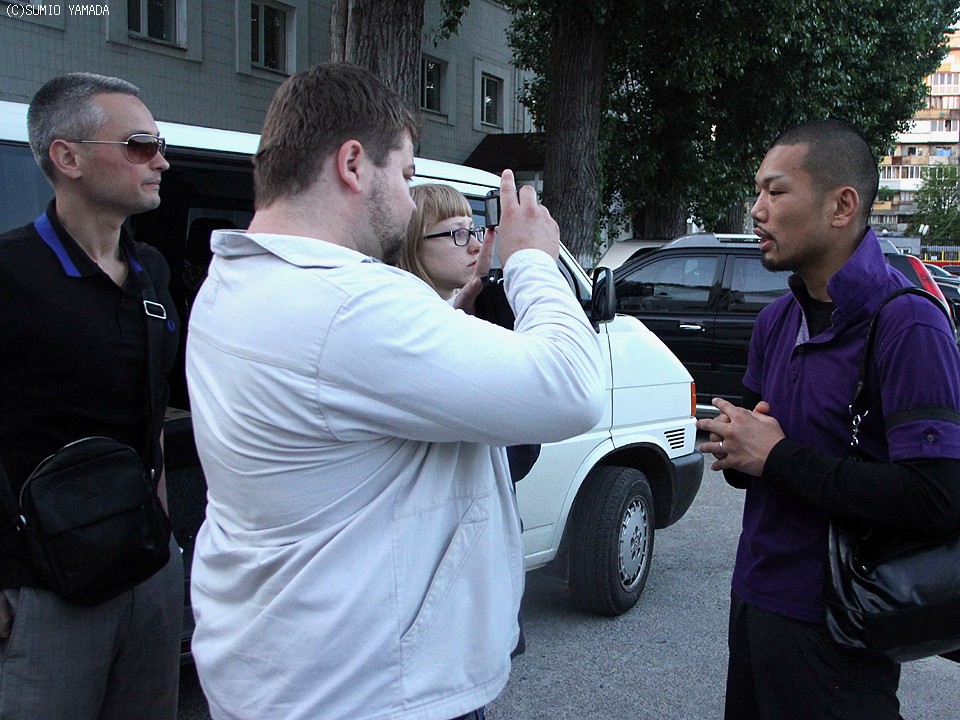 練習後、地元メディアの取材を受けた淵上。ゴロフキンの試合をすでにビデオ、ネットで観ているが、改めて王者の練習を見て「隙がなくパンチも強烈。このような王者に挑戦できることを光栄に思う」とインタビューに答えた。