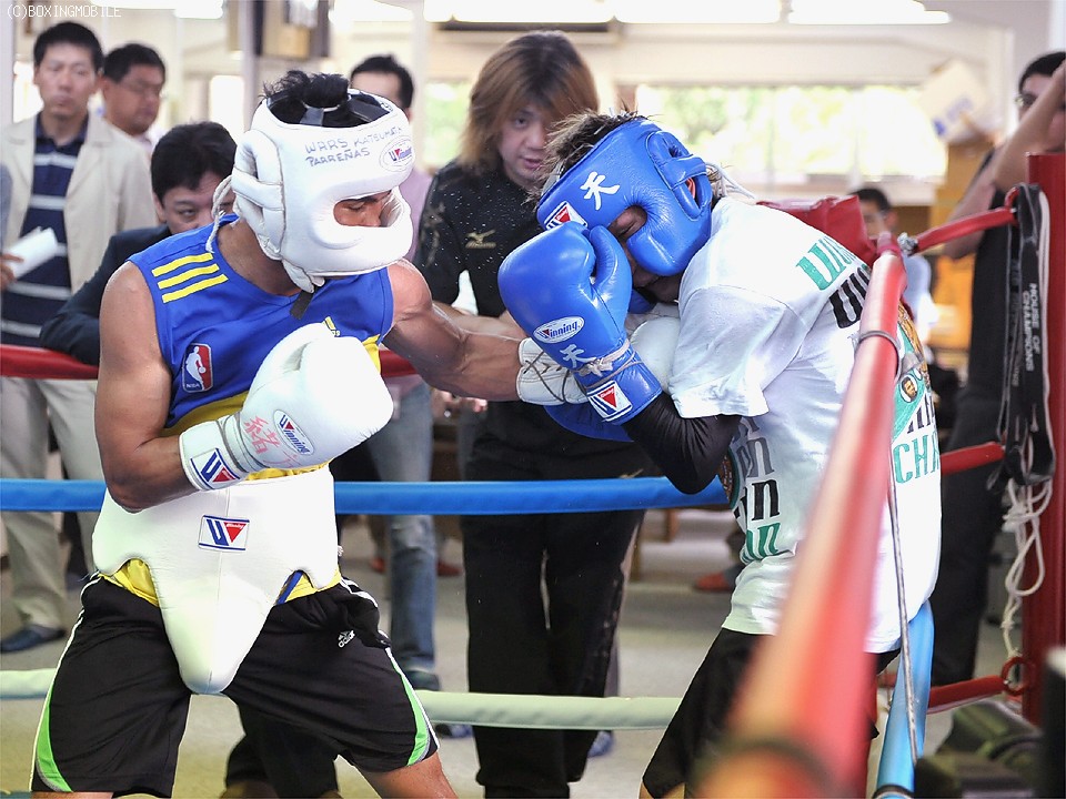 公開スパーリングに移った佐藤は、WBC世界フライ級15位ウォーズ・カツマタ(勝又)を"仮想"シルベスター・ロペス(比)に見立て拳を交えた。