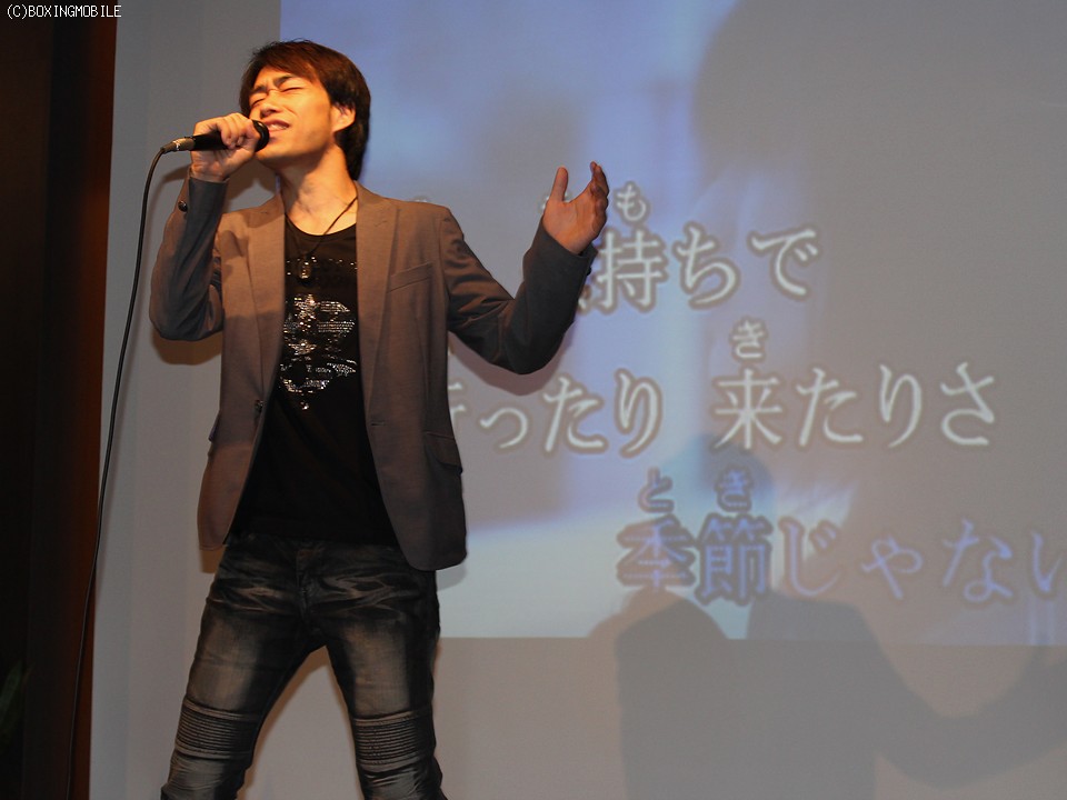 会場に用意された大型スクリーンには、渡部が日本&東洋太平洋タイトルを奪取した井上庸戦、剛打の右フックで王座を防衛した庄司恭一郎戦と、2冠王者としての軌跡が流された。そしてサプライズゲストとして、1980年代後半にローラースケートで歌って踊り、一世を風靡した男性アイドルグループ"光GENJI"の山本淳一氏が登場すると、名曲・ガラスの10代を熱唱し会場を盛り上げ、そして「あきべぇ!!世界チャンピオンになれよ!!」とエールを送った。