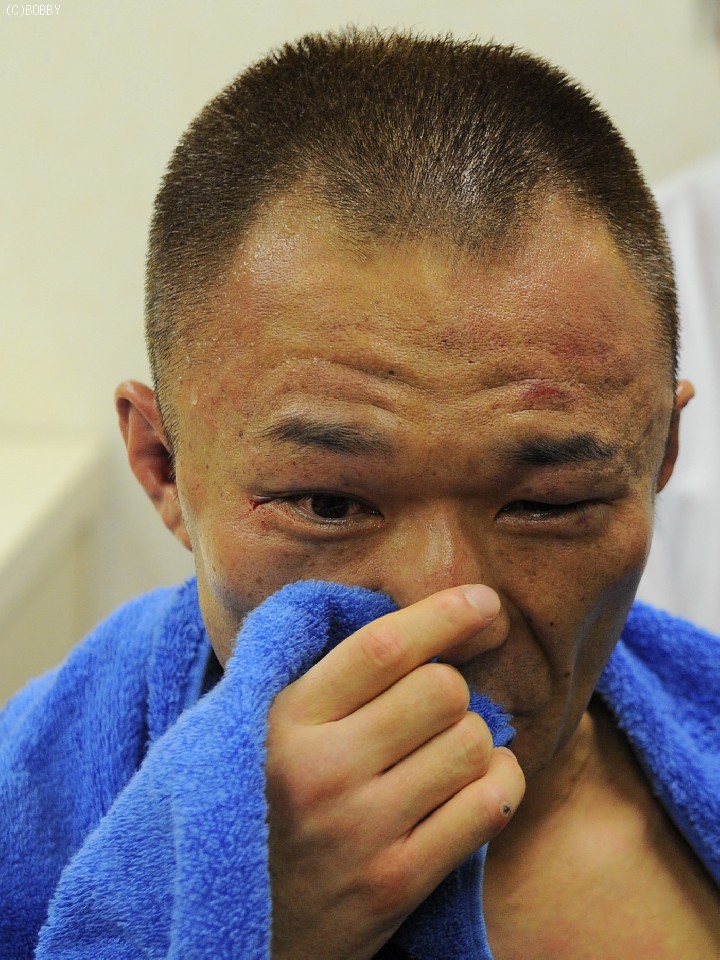 3度目の世界挑戦を実現させるべく、ボクシング人生を懸けた戦いに敗北を喫した挑戦者・嶋田が控え室で会見を開いた。「中途半端に仕掛けると、やられるのは分かっていた。1ラウンドから飛ばしていったが…。荒川選手は"心"も"スタミナ"もシッカリした良い選手ですね。後悔はないです」と試合を振り返った。