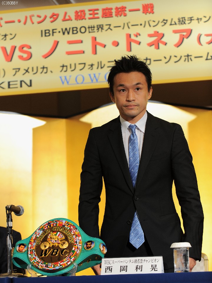 当日の西岡VSドネア戦を放送するWOWOWが、代表質問としてドネア戦の心境を尋ねると西岡は「海外ではジョニゴン、マルケスと戦ってきたが、ドネアという世界で評価される相手と戦えるのは燃えられる。この一戦は"熱望"していた戦いです」と気持ちの高ぶりを抑え切れないといった表情をうかがわせた。WBCより勝者にダイヤモンドベルトが送られることに「このベルトは4人しか持っていない。ダイヤモンドベルトにWBO・