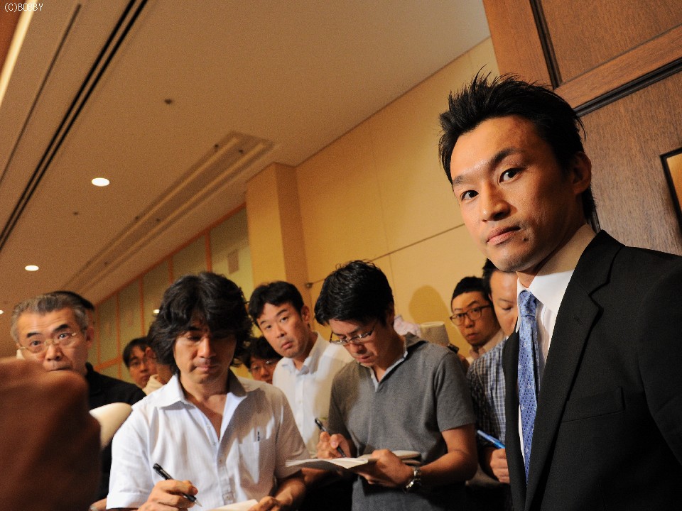 多くの報道陣が集まる中で、WBC世界スーパーバンタム級名誉王者・西岡がドネア戦に懸ける意気込みを語った。「去年の末からドネア一本に絞って練習を積んできた。本当にどうなるか分からない状況で決定したことに"ワクワク"している。ドネアとの"頂上決戦"に、僕自身が楽しみでしょうがない