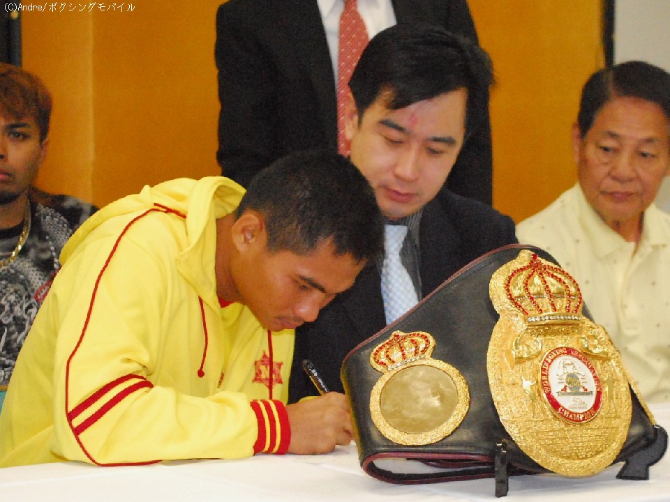 30日、いよいよ二日後に迫った名城信男(六島)の最後の戦い『WBA世界スーパーフライ級タイトル戦』の調印式が大阪市内で行われ、王者・テーパリット・コーキャットジム(タイ)と挑戦者の名城信男がグローブチェックを済ませ、揃って会見を開いた。