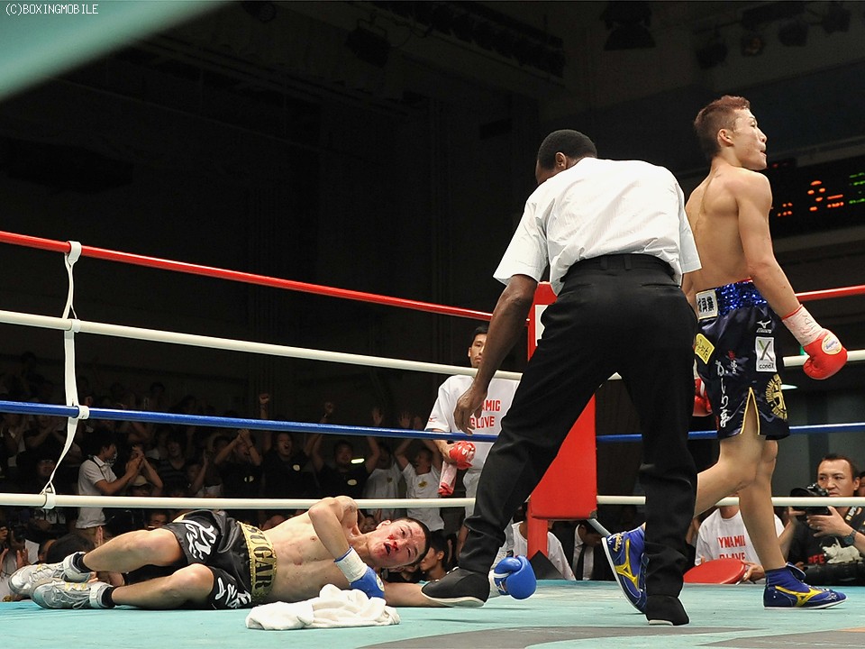 王者・金子はステップを踏みリズムを作り、ジャブで距離を測ると、挑戦者・佐藤を右ストレートで貫き主導権を握る。ここで金子は一気に仕掛け、左フック・右ストレートで佐藤からダウンを奪う。すると2R、王者は右アッパーで挑戦者のアゴを跳ね上げダウンを追加。ダメージの深い佐藤に対し、金子は追撃の手を緩めずワンツー・右ストレートを突き刺すと、挑戦者はキャンバスに崩れ落ちると同時に、青コーナーよりタオルが投げ入れられた。