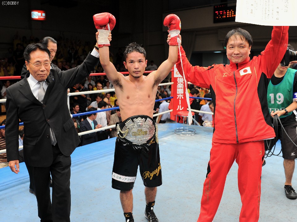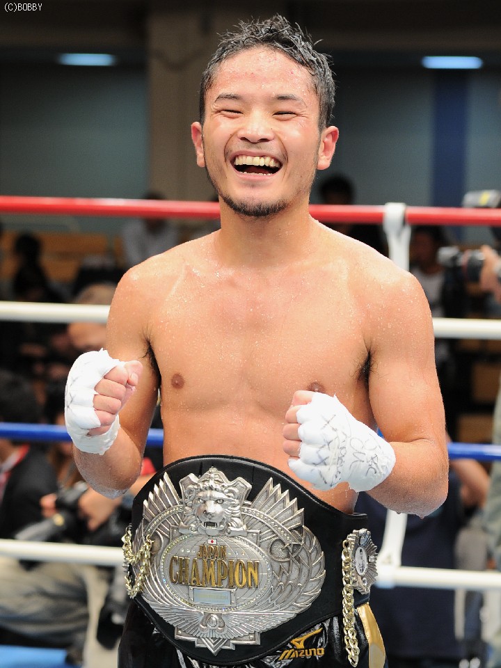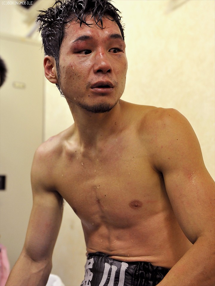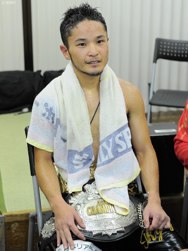 同門の先輩"音速の拳"八重樫東がその腰に巻いた、日本ミニマム級タイトルの新たな持ち主となった原隆二が控え室で会見を開いた。「試合は終わりましたが、内容はダメでした。序盤は良かったが、一発パンチをもらってからペースも落ち、スタミナも…。もっと精神面を鍛えないといけない」と試合を振り返った。