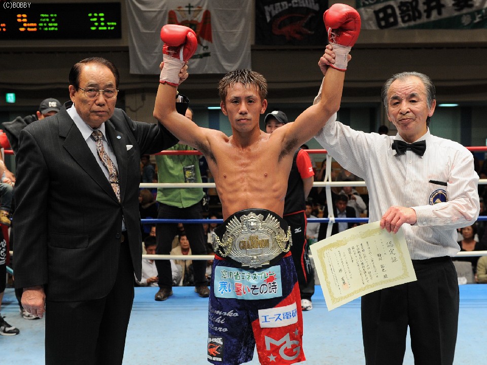 王者・粉川は軽快なステップで距離を保ち、スピード感溢れる連打を浴びせ、危なげない内容でタイトルを守り抜いた。