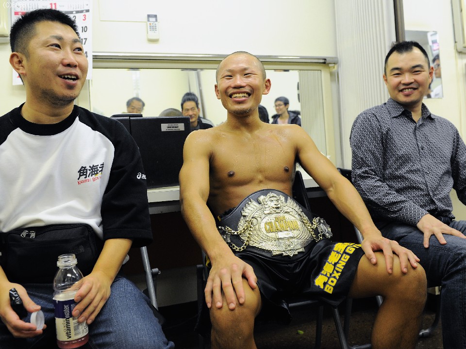 2度目の防衛戦に続き、V3戦も鮮やかな右ストレートで挑戦者を屠った王者・加藤が控え室で会見を開いた。「最初にダウンを奪ったパンチは力みもなく、自然に出たパンチだった。右ストレートから次につなげていく作戦だったが、その右で決まった感じですね」と試合を振り返った。