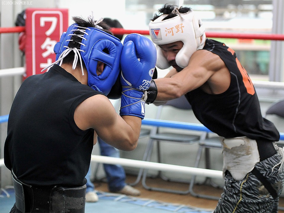 大晦日に東京・大田区総合体育館でWBA世界スーパーフライ級王者テーパリット・コーキャットジム(タイ)に挑む、WBA同級10位"タフボーイ"河野公平が20日、同門の世界王者・内山高志とともに所属するワタナベジムで公開スパーリングを行った。