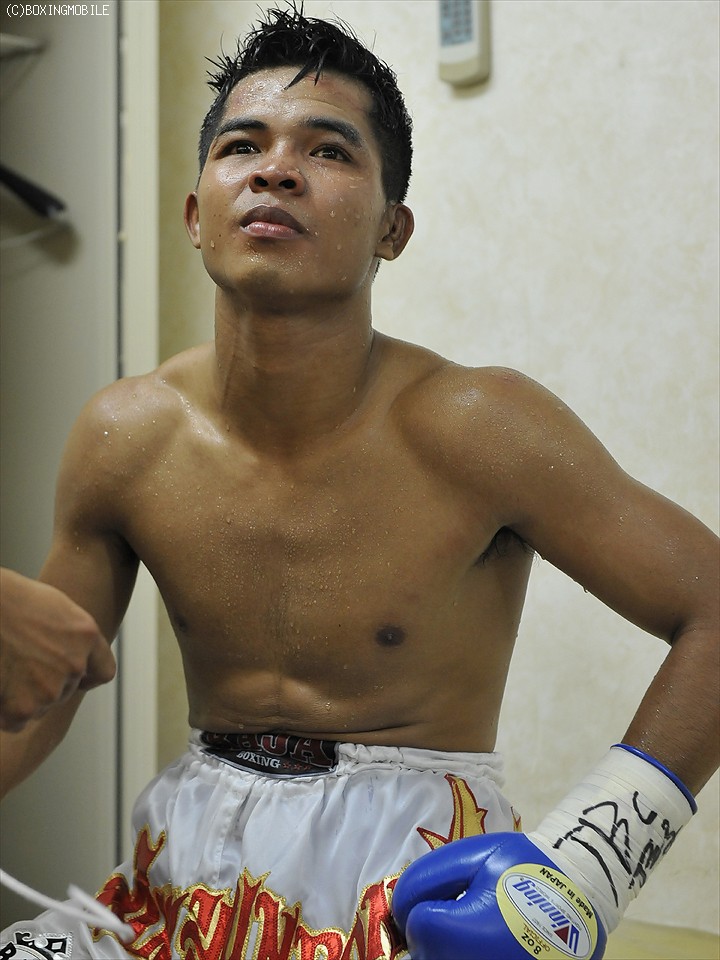 王者の左ボディに10カウントを聞いたエーククンポンは「胃の辺りに入って今も苦しいよ。ダメージはボディの1発だけで、他は我慢できた。サイトウはスピードがあった。ライト級は減量が厳しかったし、ジャパンの寒さにも慣れなかった」と本来はスーパーライト級がベストウェイトと語り、日本の気候にも戸惑いがあったと苦笑いを浮かべた。