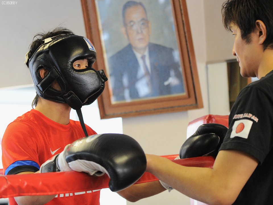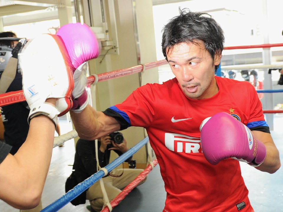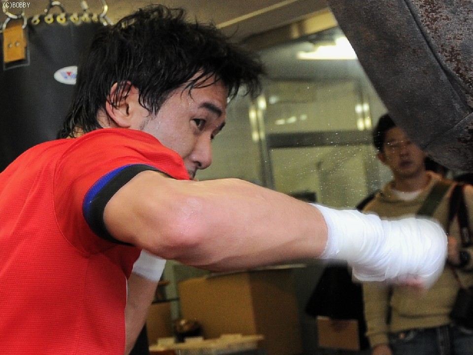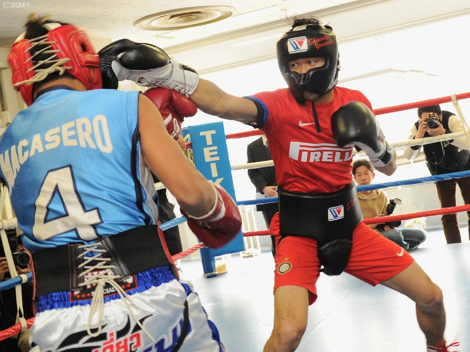 会見が終わり、山中は集まった報道陣に対し、比国ライトフライ級9位フェルナンド・オコンをパートナーに3ラウンドの公開スパーリングを実施した。