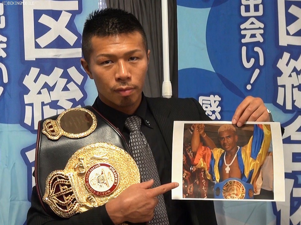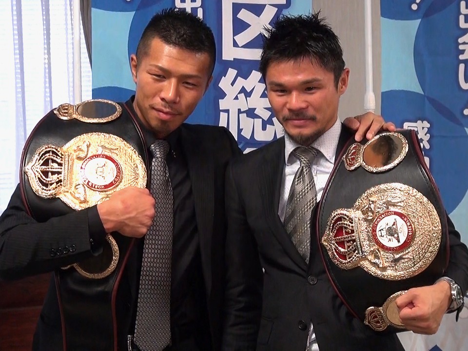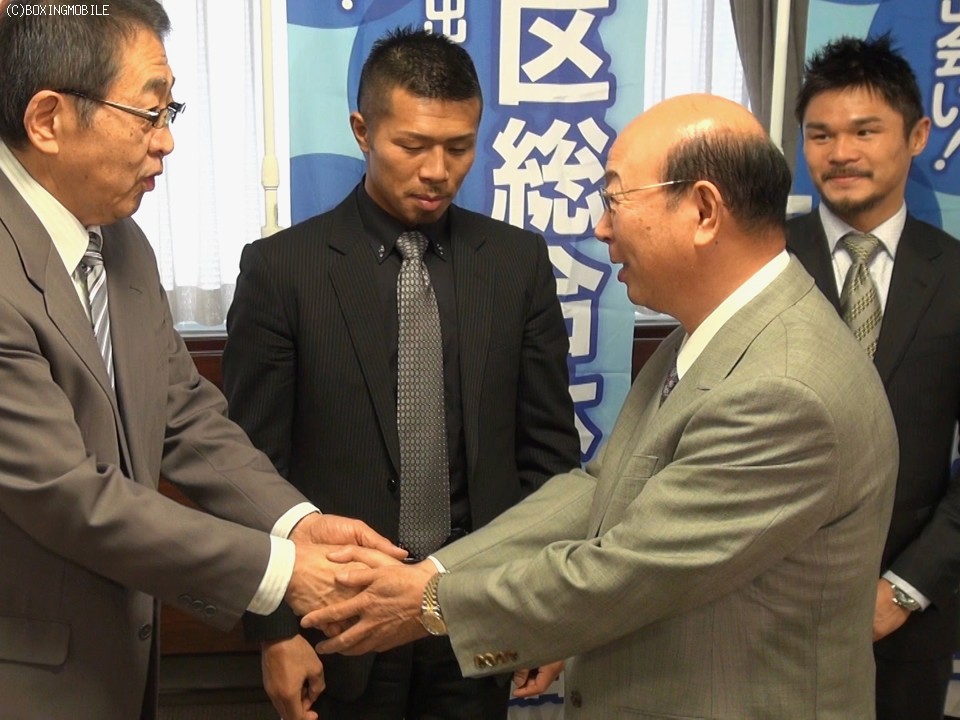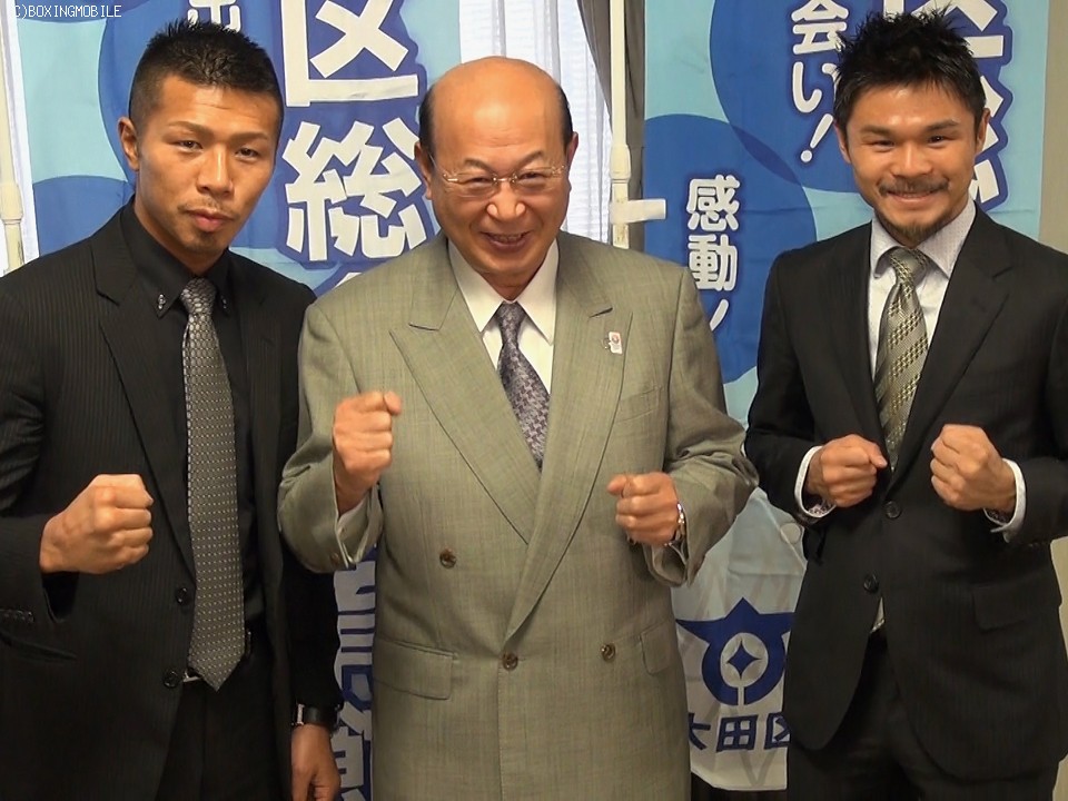 表敬訪問では、松原大田区長がWBA世界スーパーフェザー級王者・内山高志、WBA世界スーパーフライ級王者・河野公平に挟まれ「2人の世界チャンピオンに囲まれて、これは凄いことですね!!」と満面の笑顔で記念撮影となった。