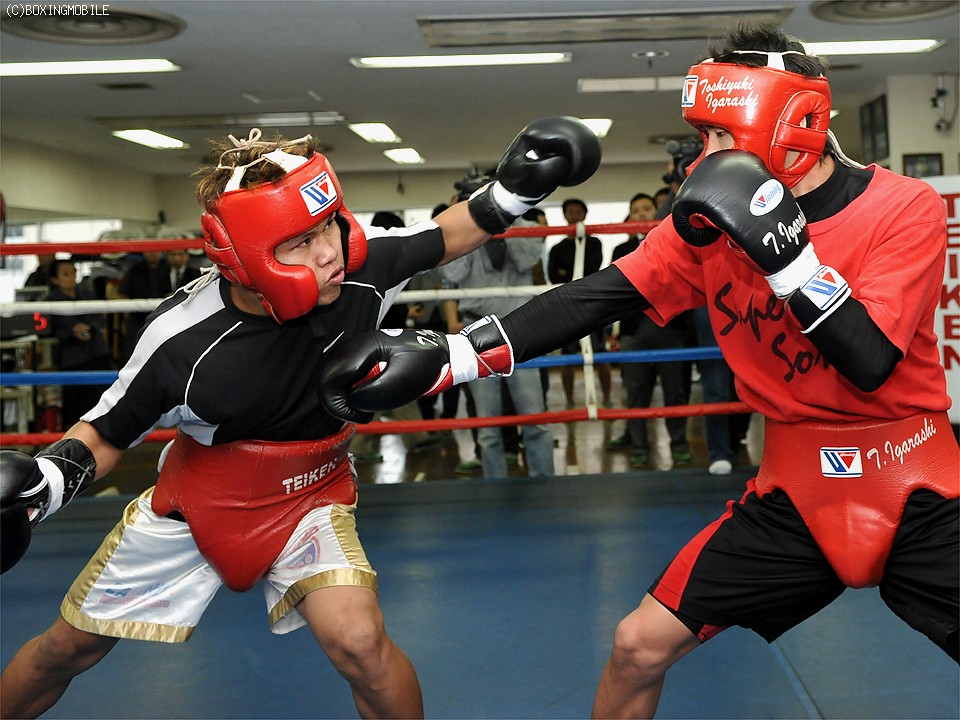 帝拳ジムには大勢のマスコミ陣のほかに八重樫側の大橋秀行会長、松本好二トレーナーの姿もあった。敵陣の目が光るなか、八重樫よりも3センチほど上背のあるOPBFライトフライ級13位ジェイソン・カノイ(比=22歳、16勝11KO3敗2分)を相手に五十嵐はスパーを行った。前に出ようとするパートナーを左構えからの右ジャブと足さばきでコントロールし、タイミングのいい左ストレートを折々で上下に散らすなど挑戦者対策の一端を披露した。
