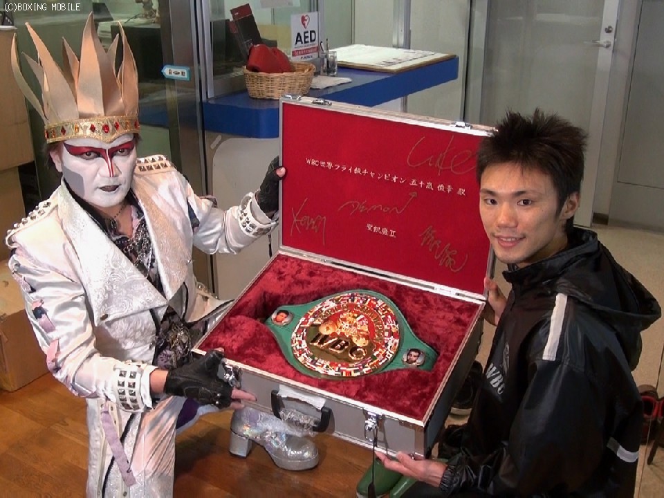 「ボクシングジムを訪れるのは初めて」というデーモン閣下は、五十嵐へのプレゼントとして、『チャンピオンベルトケース』を渡した。