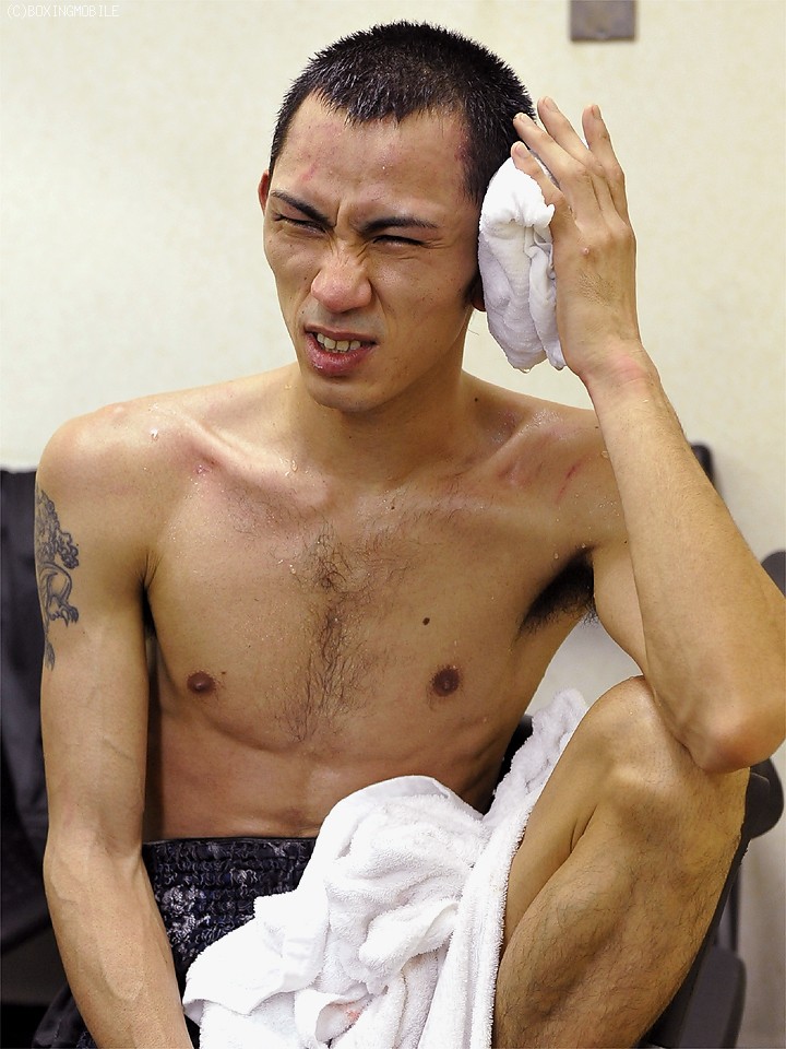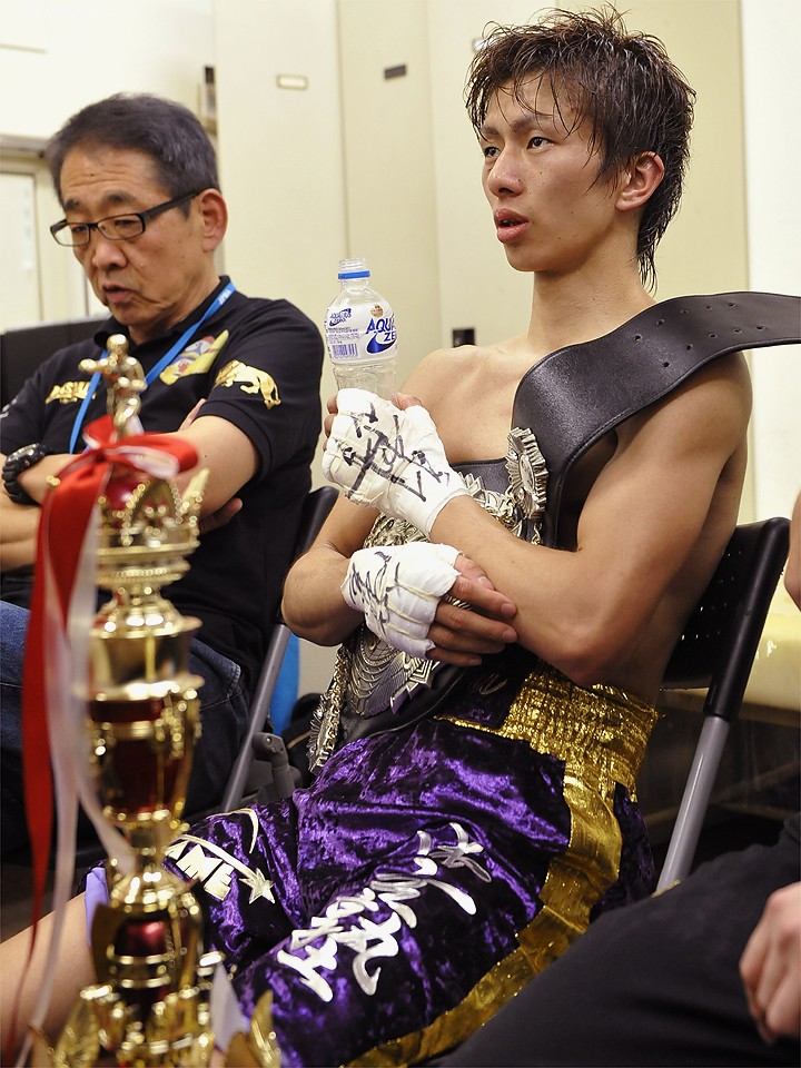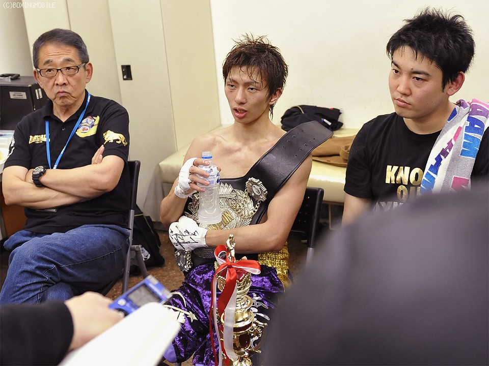 切れ味抜群の右ストレートで知念からポイントを奪い、日本ライトフライ級タイトルを奪取した田口が控え室で会見を開いた。「ボディが打ち難かった。あまりボディが打てず、カウンターを警戒しすぎたことを反省している。知念選手の左フックは見えていたし、集中を切らさず戦えたのは良かった(笑)。内山さんのボクシングを参考にしているし、自分のスタイルを貫けば勝てると思い戦った」と試合を振り返った。