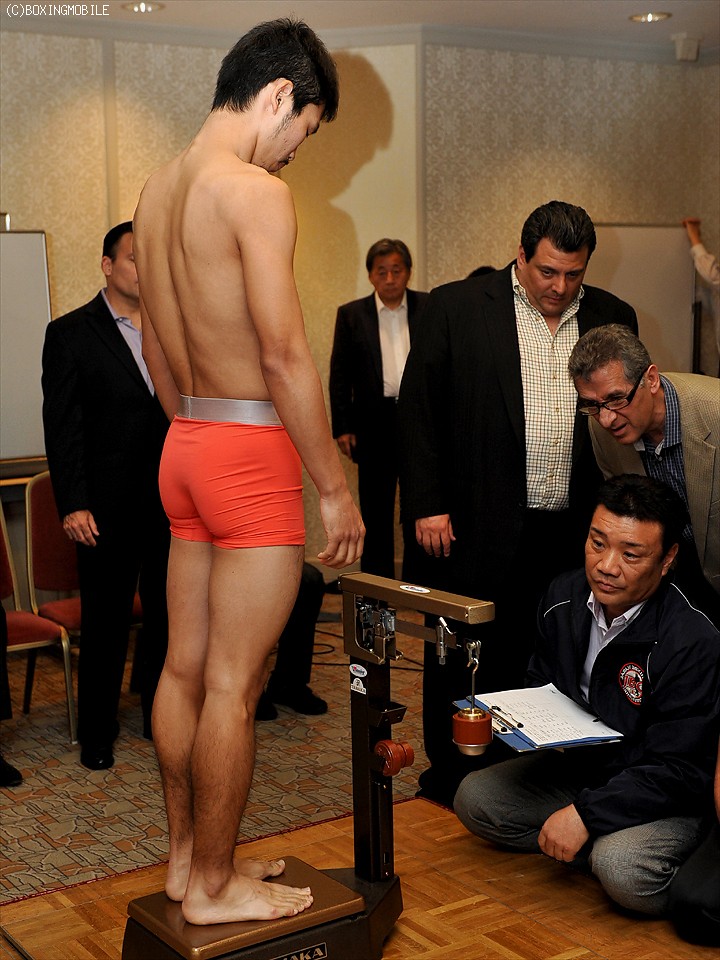 WBCの立会人マウリシオ・スレイマン氏をはじめ試合役員、関係者、マスコミ陣らが注目するなか、計量は午後1時から行われた。最初にバンタム級王者の山中が秤に乗り、リミットちょうどの53.5キロでパス。挑戦者のツニャカオも53.3キロで難なくクリア。