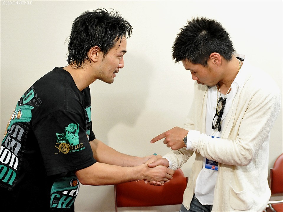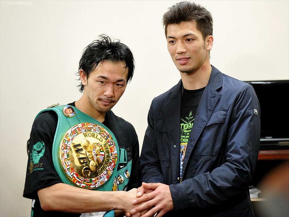 控え室には高校の3学年後輩でもあるロンドン五輪ミドル級金メダリスト、村田諒太が祝福に訪れた。カメラマンから一緒にベルトを持つようリクエストされた村田だが、「これは先輩のものだから」と手を触れなかった。山中は「自分でも強くなっていると思うし、きょうはちょっとでも(パンチが)当たると効くということが分かったのが収穫です」と会見を締めくくった。