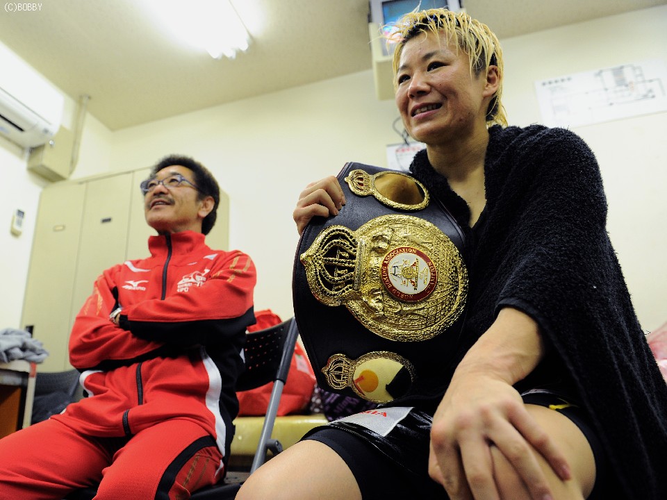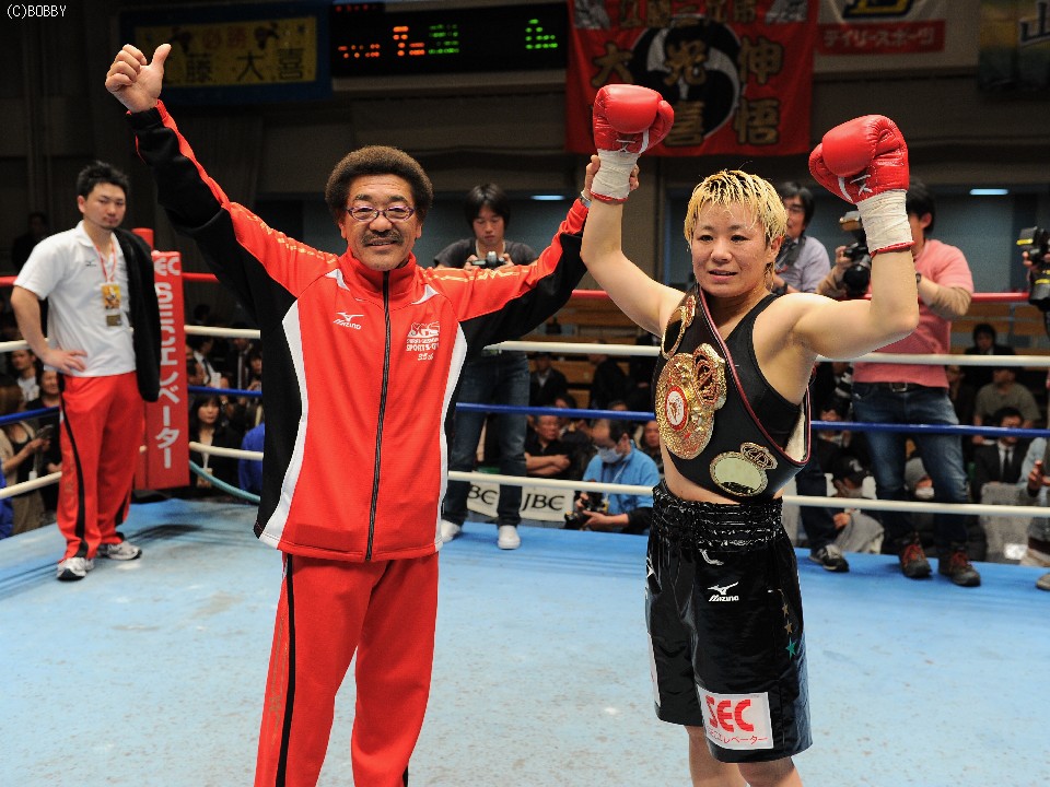 ここで具志堅会長は「タイトル奪取、初防衛と判定勝ちだったので、僕としては80点かな(笑)。今後は指名試合もあるが、藤岡奈穂子との対決もありかもよ。T&Hジムの竹原会長から、僕に毎日電話があるんだ」と女子最強決定戦を示唆すると、この発言に豪腕娘も「藤岡さんと試合をすることになったら面白い!!私としても楽しみな一戦ですよ」と対戦に意欲を見せた。