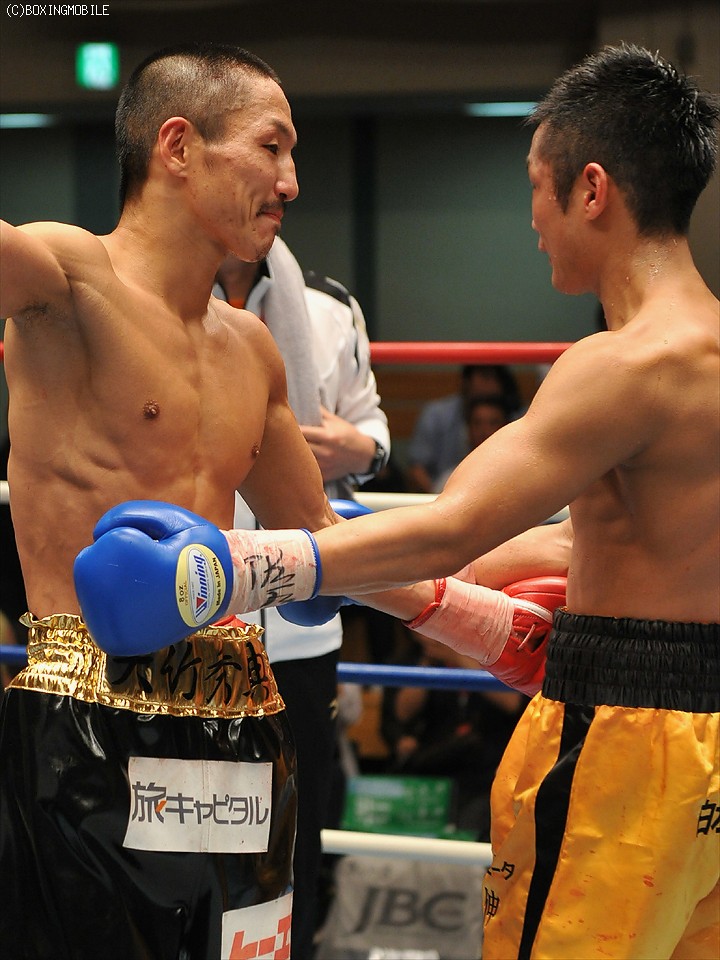 ジャブの刺し合いから、挑戦者・土居は左フック・右ストレートを王者・大竹にヒット。すると2回、土居は右ロングフックで大竹をグラ付かせる。中盤、大竹は圧力を掛けワンツー・左フックで顔面を捕えるが、土居もジャブでリズムを作り、右ロングフックを浴びせる。しかし7回、王者は圧力を強め、右ストレート・左フックで挑戦者を仰け反らせる。土居は5・7回に偶バツで眉間と額をカット。そして8回、大竹はワンツーを打ち込むが土居に頭が当たり、バッティングで減点1。ここで土居の眉間と額の傷が悪化、8回1分40秒負傷判定に。王者・大竹が的確な右ストレートでポイントを奪い、僅差判定3-0(76-75・76-75・77-75)で挑戦者・土居を退けた。