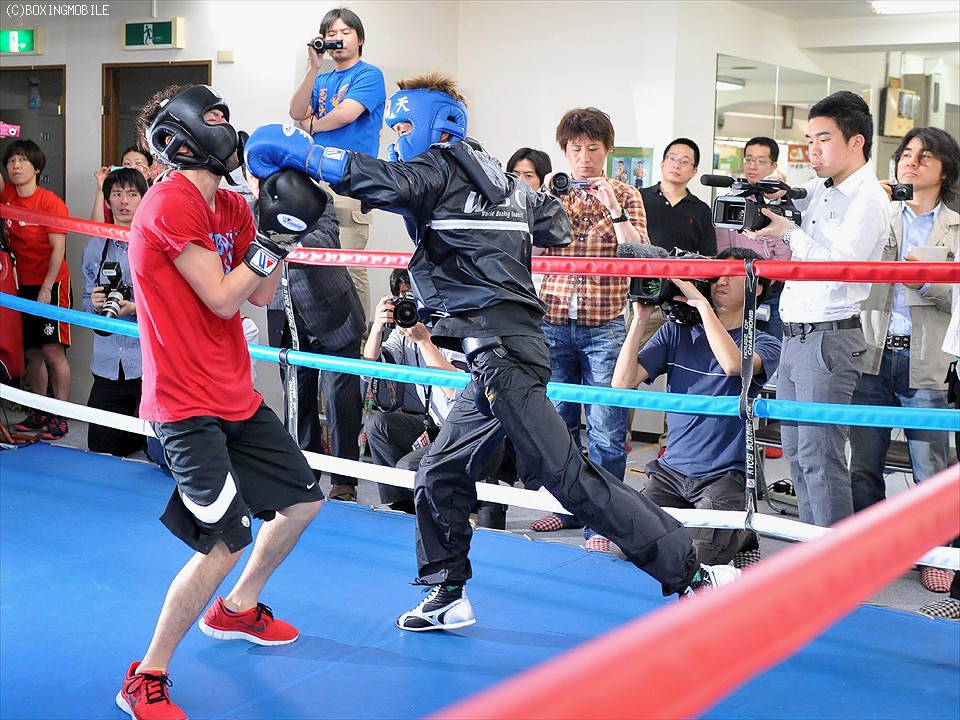 会見終了後、佐藤は2ラウンドのシャドーで身体を温め、同門のバンタム級6回戦・佐藤鋼太をパートナーに4ラウンドの公開スパーリングを行った。序盤から佐藤がジャブでパートナーをコントロールし、ミドルレンジからワンツー・左ボディを突き刺せば、強引に詰める佐藤(鋼)に対し、バックステップからカウンターの右ストレート・左フッ