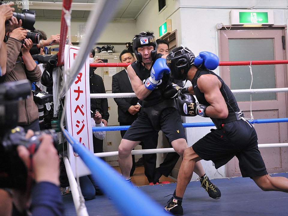 公開練習に移った内山は、同門のスーパーフェザー級8回戦・山元浩嗣と2回のスパーリングとなった。足を使いジャブ・右ストレートで仕掛ける山元に対し、内山は強烈なプレッシャーで間合いを詰め、右クロス・右ボディストレートをヒットさせる。山元も右アッパー・左フックを返すが、内山は巧みなブロックから左ボディ・右ストレートを繰り出し仕上がりの良さをアピールた。
