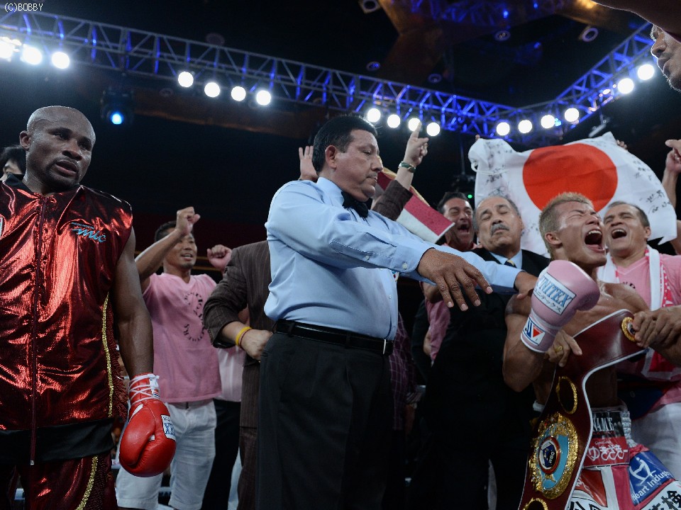 118対110、116対112、117対111という採点が読み上げられ、続いて「ニュー!」のコール。次の瞬間、亀田はキャンバスに伏した。