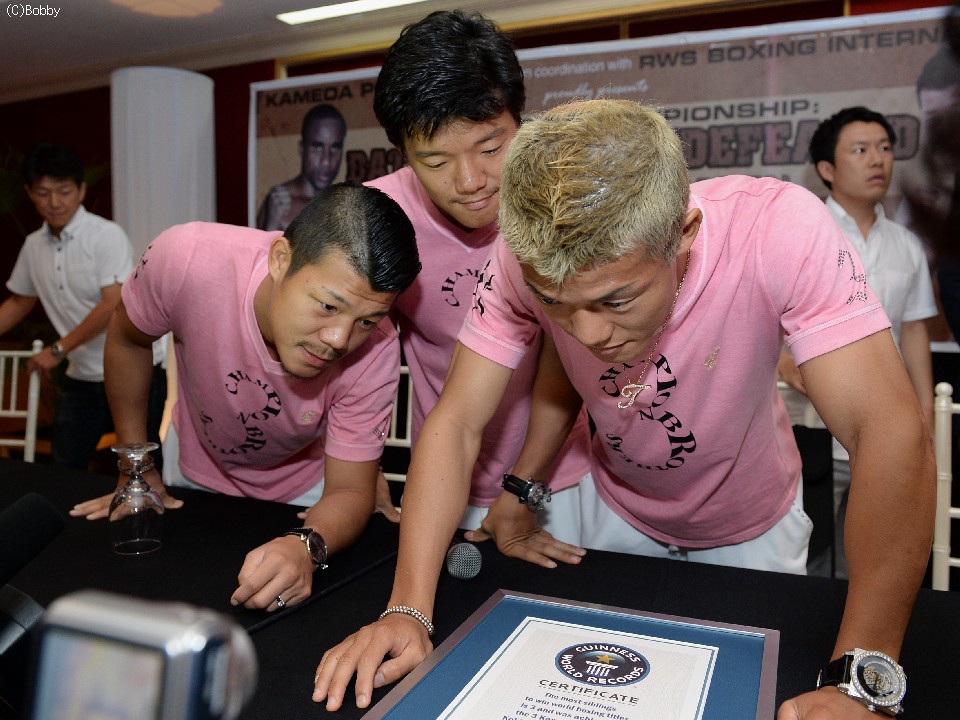 会見の前には「三兄弟がボクシング世界チャンピオンになるのは亀田兄弟が世界でも初めて」とギネス社のレコードマネージャー、チャールズ・ウォルトン氏からギネス記録認定書が手渡され、三兄弟が認定書を覗き込み嬉しさに浸った。