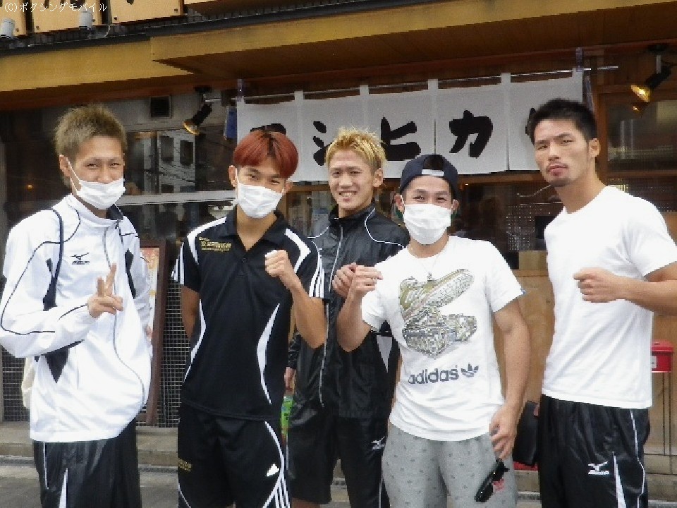 明日のダブル世界戦を前に前日計量をクリアした井岡と宮崎は、計量後、恒例となった大阪市内の「南堀江2丁目食堂」へ直行。