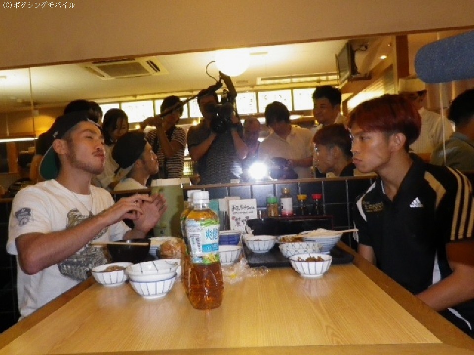 井岡は(ご飯、味噌汁、納豆、魚の煮付け、ほうれん草、大根おろし、ひじき)宮崎は(ご飯、味噌汁、納豆、大根サラダ、きんぴらごぼう)を約30分かけてたいらげた。