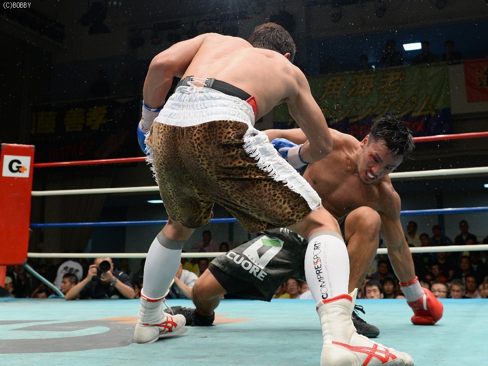 高山が圧力をかけ、諏訪が後退しながら折々で反撃するという展開になった。丁寧な左ジャブと、相手ガードの脇と正面を破って打ち込む右を中心にした攻撃で高山が着々とポイントを積み重ねていった。諏訪も機をみてパンチを返すが、主導権を奪うには至らない。フルマークで王者の無難な防衛かとみられた最終回。残り時間が30秒を切ったところで高山がダウンするという波瀾が起こった。「右フックが当たった」という諏訪と「滑って倒れただけ。ダウンをとられてビックリ」という高山。いずれにしてもレフェリーのカウントは8まで数えられ、ほどなくして試合は終了した。採点は98対93、98対92、98対91と大差がついていた。