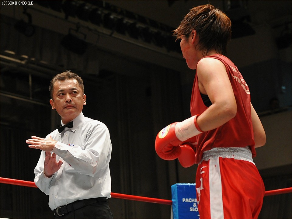 今年2月、一進一退の打撃戦を展開したものの判定を落とし、東洋太平洋王座を三好に奪われた東郷は、試合開始と同時に猛ラッシュ。ワンツーにアッパーを交えた攻撃で攻めまくった。まるで2分間で勝負を決めようとしているかのようだった。後手に回った三好は2回、逆に前に出て押し返し、ラウンド終盤には右ストレートをクリーンヒットして挑戦者の膝を揺さぶった。これで戦況は五分に戻ったが、3回には東郷が再び主導権を握る。パワフルなワンツーの連続攻撃で三好を守勢に追いやり、4回には王者の鼻から出血させた。この回終了後の公開採点は39対37、39対38(二者)と挑戦者がリード。迎えた5回、バッティングで三好の右目上脇が切れ、2度目のドクター・チェックで続行不能との診断が下された。これを受けレフェリーが試合をストップした。勝負は当該ラウンドを含めた採点に委ねられることになったが、49対47のスコアで三者とも東郷を支持。