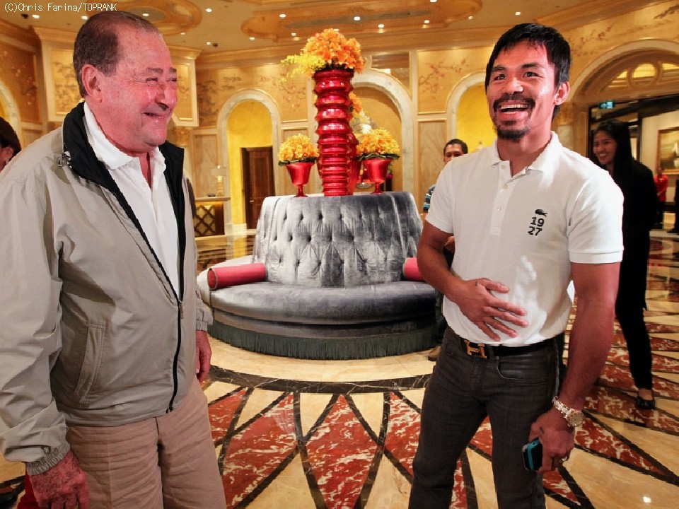 これに対しリオス陣営も負けてはいない。「パッキャオ戦を次に繋げるためのステップにしたい。大勢の人を黙らせ、自分がベストであることを証明するつもりです。試合ではすべてのラウンドを試合するつもりだし、そのためのトレーニングも積んできました」とリオスは自信を口にした。昨年の年間最優秀トレーナー賞受賞者ロベルト・ガルシア氏も勝利を確信している様子だ。「もしパッキャオが負けたらローチ・トレーナーが引退を勧告するということをテレビで見ました。引退のためのパーティーは(米国時間の)土曜の夜に始まるので、フレディはマニーに(引退記念の)金時計を用意しておいた方がいいだろう。それにマニー・パッキャオの試合をHBOのペイ・パー・ビューで見るのもこれが最後になるはずさ」